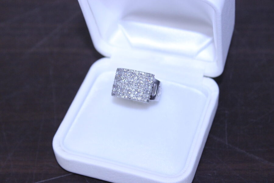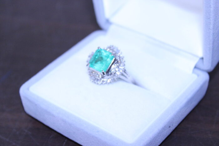ダイヤがびっしり敷き詰められたプラチナリングとエメラルドとメレーダイヤのプラチナリング2点です。