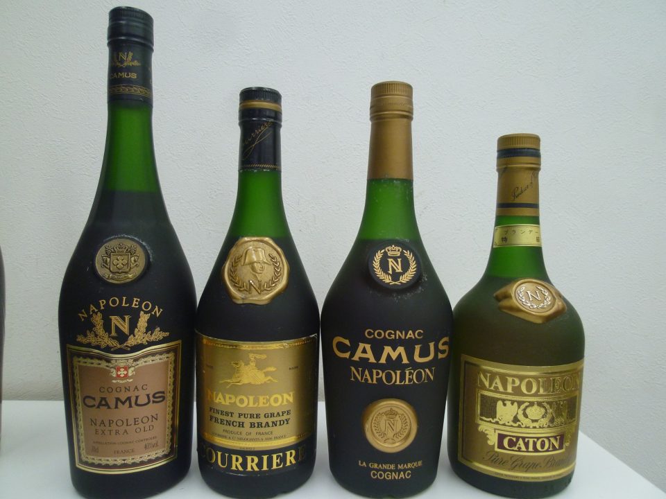 すりガラスのような半透明の濃い緑色のボトルの「ナポレオン」と書かれている洋酒たち。